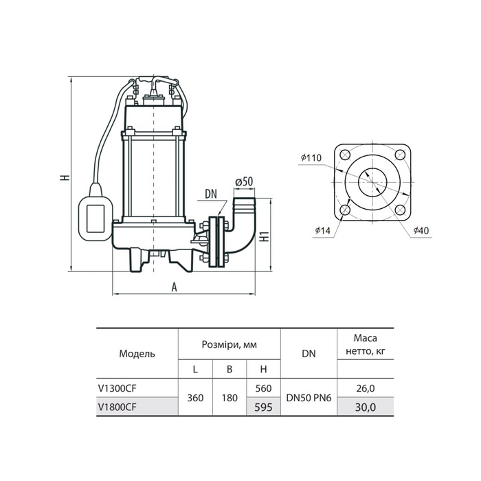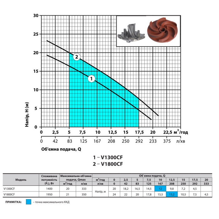 | V1300CF | 1400 | 20 | 333 | Напор, м |