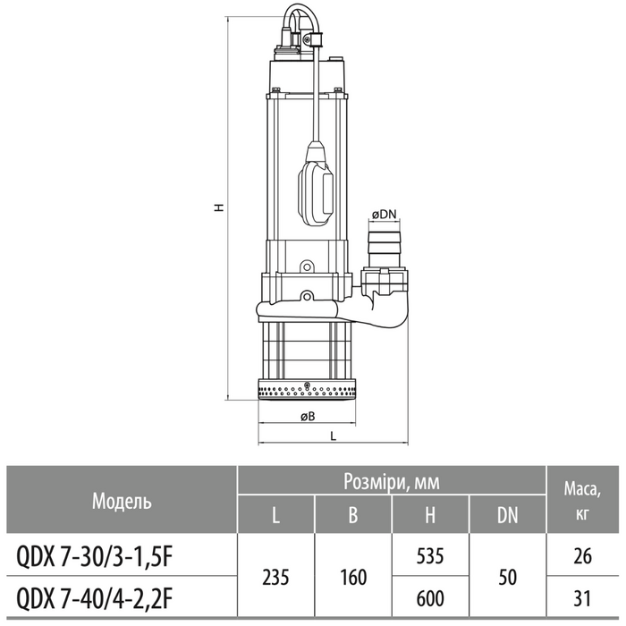 QDX 7-30/3-1,5F, QDX 7-40/4-2,2F – це дренажні багатоступінчасті вертикальні занурювальні електронасоси. Призначені для відведення води із затоплюваних приміщень; перекачування дощової і фільтраційної води; наповнення або осушення басейнів, водних атракціонів і забезпечення циркуляції води в них; подачі води з колодязів, цистерн і відкритих водойм для систем поливу в садівництві, сільському і лісовому господарстві там, де використовуються системи зрошення і поливу.