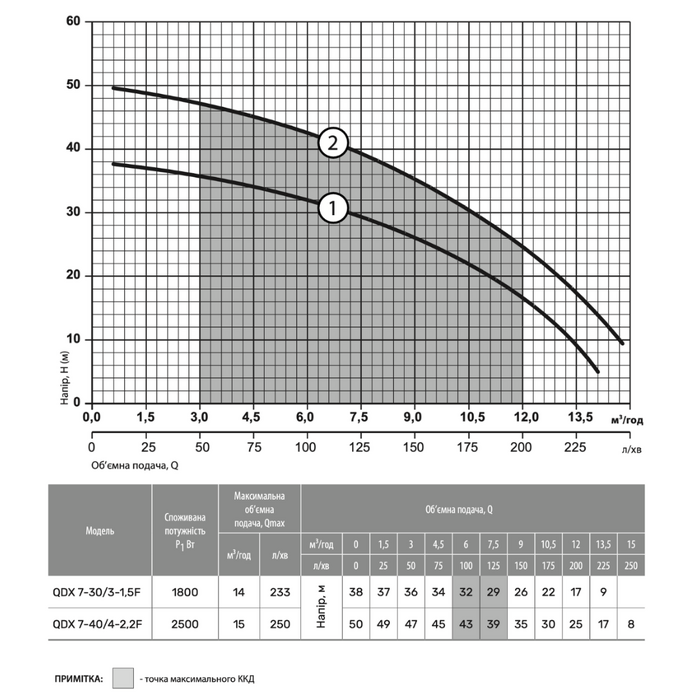 | QDX 7-30/3-1,5F | 1800 | 14 | 233 | Напір, м |