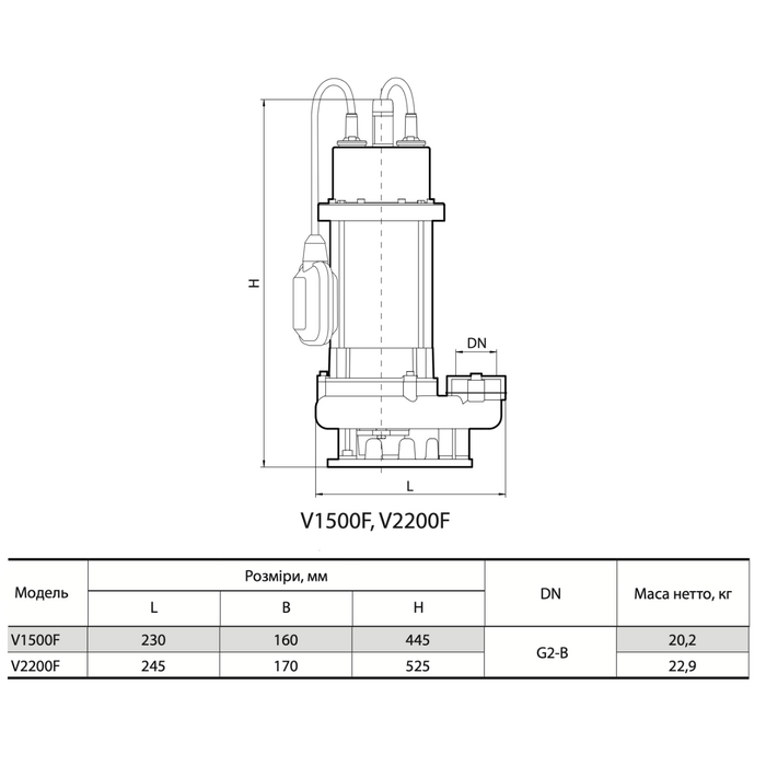 • Електронасос – вертикальний, занурювальний, моноблочного типу, що складається з асинхронного електродвигуна та насосної частини: корпуса, робочого колеса, ущільнення торцевого та подрібнюючого механізму (тільки у моделі V1300D).