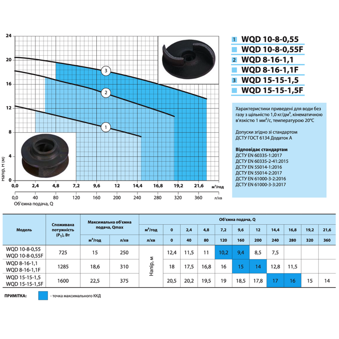 • колесо робоче – відцентроване, закритого (WQD8-16-1,1(F) и WQD15-15-1,5(F)) або напівзакритого (WQD10-8-0,55(F)) типу, вироблено з чавуну