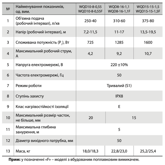 • укомплектований вимикачем поплавця (тільки для моделей з літерою "F")