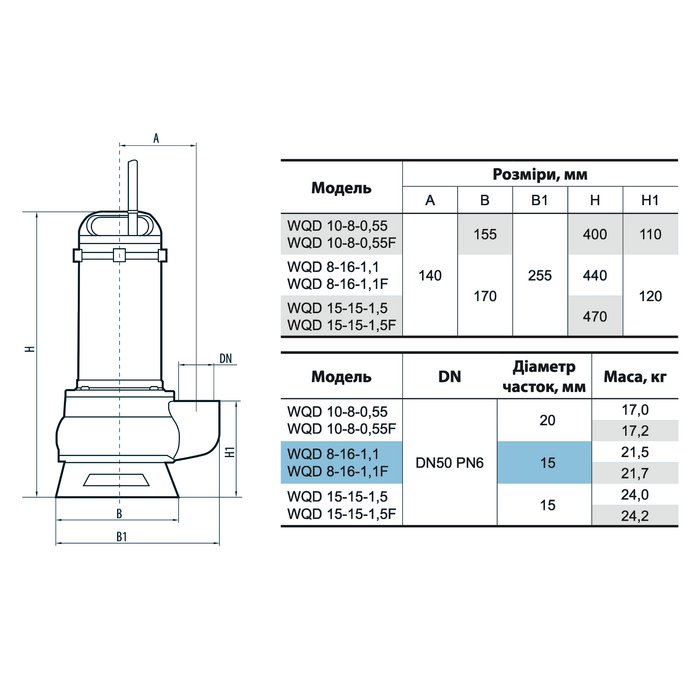 • колесо робоче – відцентроване, закритого (WQD8-16-1,1(F) и WQD15-15-1,5(F)) або напівзакритого (WQD10-8-0,55(F)) типу, вироблено з чавуну